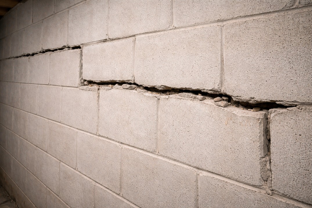 Bowing walls, horizontal cracks, efflorescence, persistent damp smells by the time these appear, the structural process behind them has typically been underway for years. Stair-step cracking in block walls, mold at floor level, and spalling masonry are signs that moisture and movement have already worked their way through the surface layer. The visible damage is the result, not the beginning.